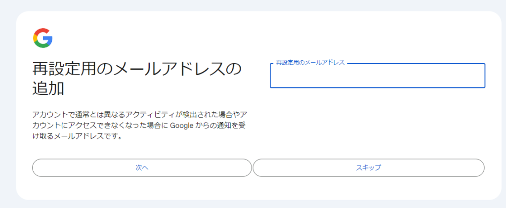 上記の設定が完了しましたら、Googleアカウントを再設定するための情報を送るメールアドレスを設定してください。
